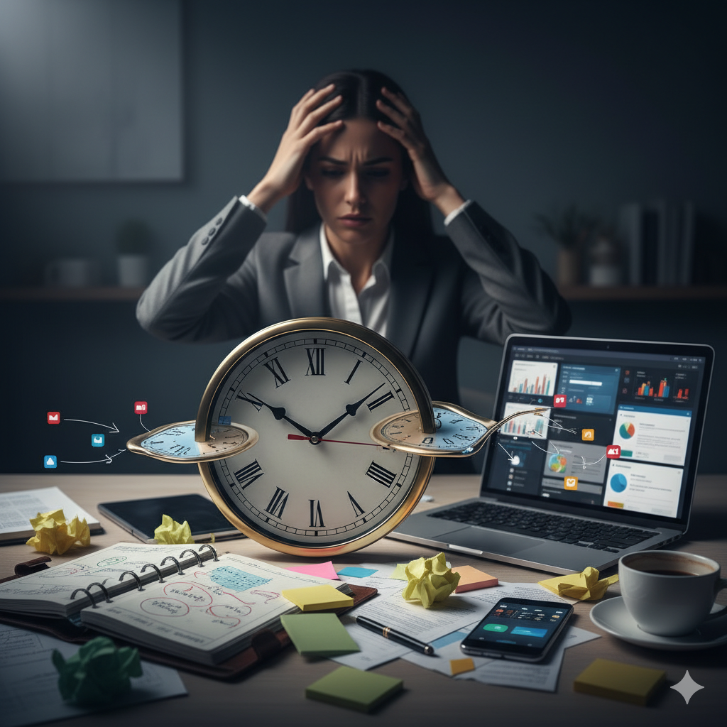 Este é um dos sintomas mais frustrantes. A “cegueira para o tempo” faz com que você não consiga estimar realisticamente quanto tempo uma atividade levará. Você se compromete com prazos irreais, lota a agenda e, invariavelmente, se atrasa ou entrega um trabalho de qualidade inferior sob estresse, sem contar quando se atrasa para um compromisso importante porque achava que daria tempo.